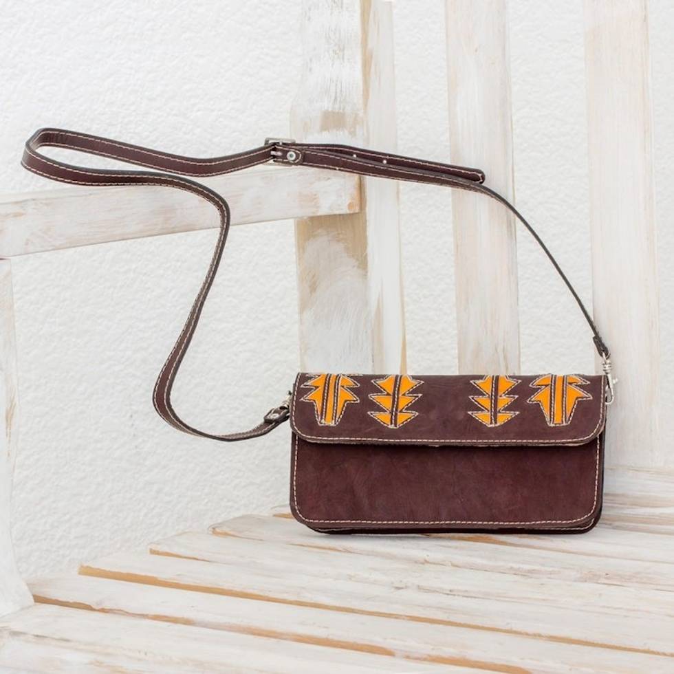 "This small and stylish sling bag is designed by Nicaragua's Donald Flores, who takes his inspiration from pre-Colombian art. Artisans craft the bag from espresso-hued leather with cut-out accents in saffron. The sleek shoulder bag features a strap that is both adjustable and removable, so you can carry the bag as a clutch if desired. The interior has two open pockets to keep small items close at hand. Flores names his design after the madrono, the national tree of Nicaragua."