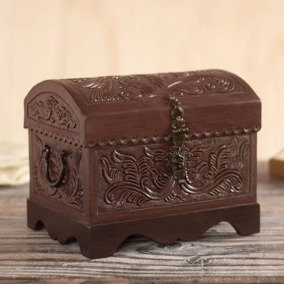 Brown Bird Pattern Leather and Wood Decorative Box from Peru 'Avian Enchantment' Item ID: 2671691489