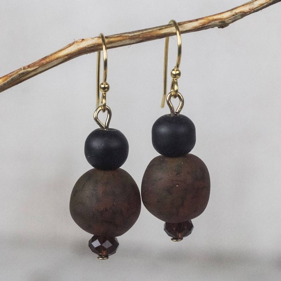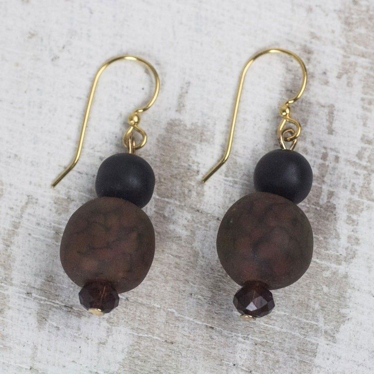 Brown-Black Recycled Glass and Plastic Bead Dangle Earrings 'Renewed Strength' Item ID: 2671806387
