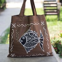 Brown Cotton Fish-Motif Tote Bag 'Blowing Bubbles in Brown' Item ID: 2671804474