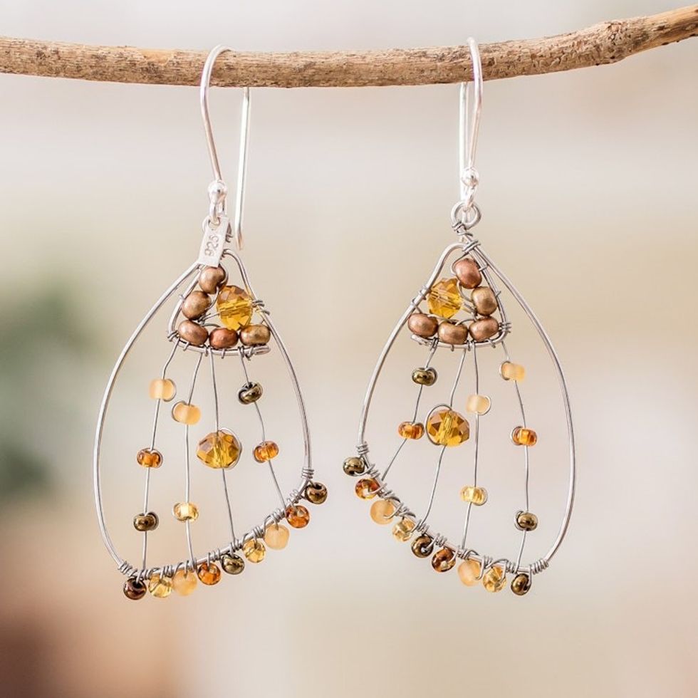 Brown Crystal Glass Beaded Butterfly Wing Dangle Earrings 'Brown Wings of Freedom' Item ID: 2671771342