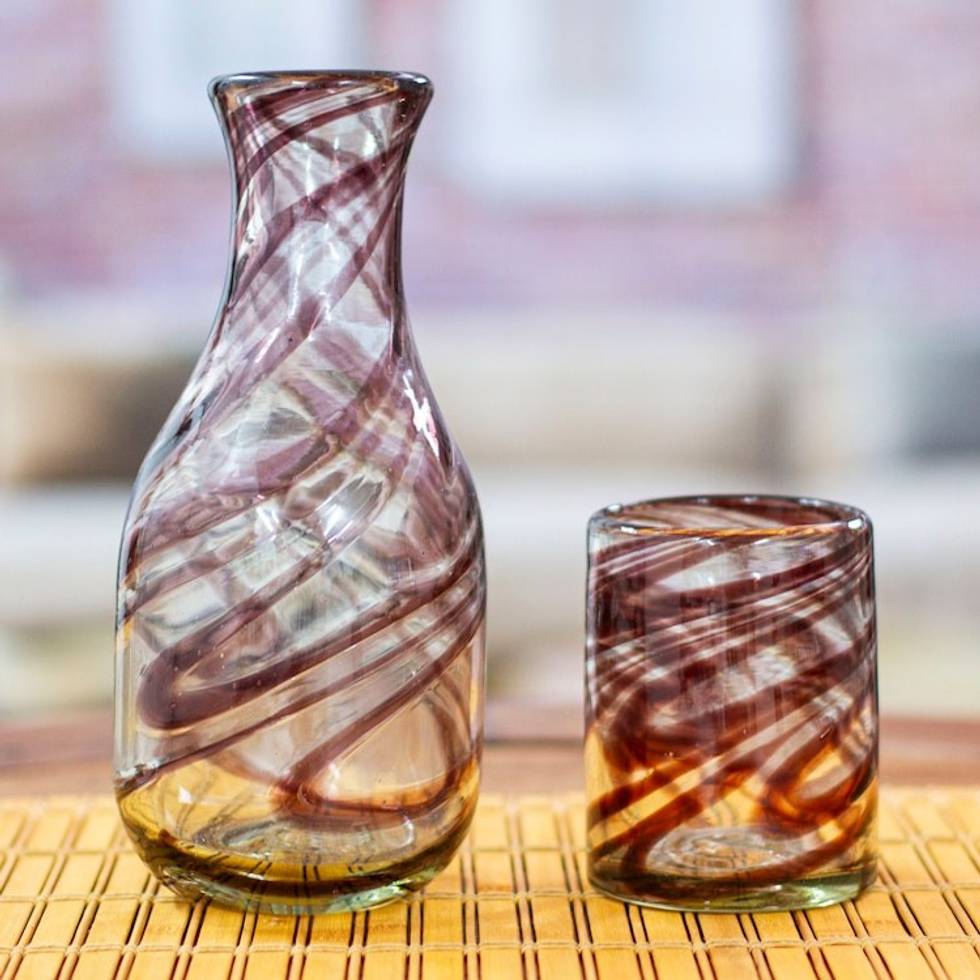Brown Handblown Recycled Glass Carafe and Cup Set Pair 'Hypnotic Brown' Item ID: 2669897948