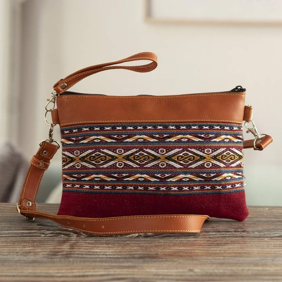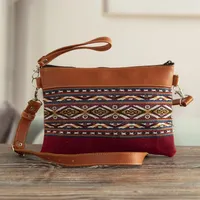 Brown Leather and Handwoven Cloth Clutch and Shoulder Bag 'Cusco Geometry' Item ID: 2669904381