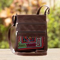 Brown Leather Sling with Mola Textile and Adjustable Strap 'Brown Forest' Item ID: 2671399555