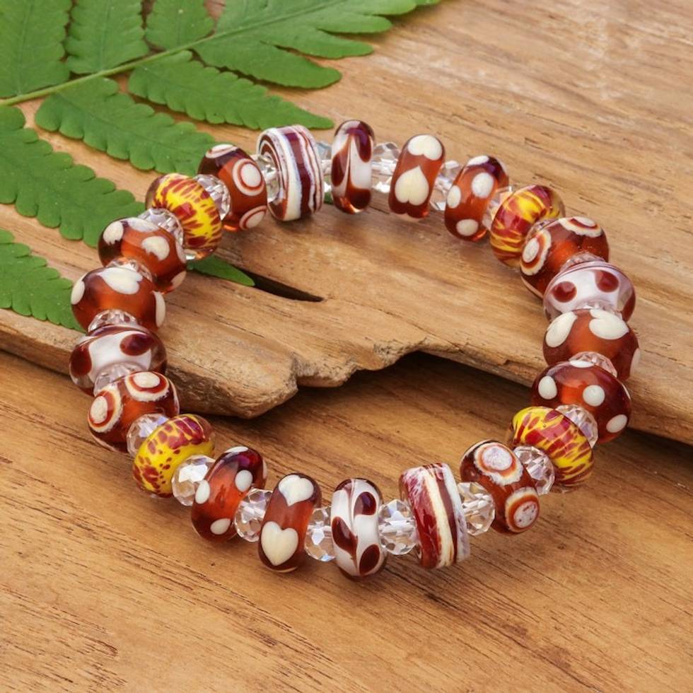 "Celebrate art and craftsmanship with this captivating stretch bracelet, handcrafted from blown glass beads using traditional techniques. With clear, brown, white and yellow glass beads, it boasts abstract, heart, floral and leaf motifs, making it both whimsical and elegant. Thai artisan Alexx Cheng brings years of expertise to this delightful, one-of-a-kind accessory that also features petite crystal beads."
