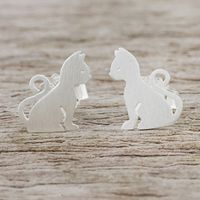 Brushed Silver Cat Stud Earrings from Thai Artisan 'Waiting for Love' Item ID: 2671800922