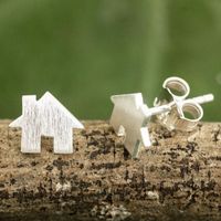 Brushed Silver Earrings in House Shape from Thai Artisan 'Home Sweet Home' Item ID: 2671802183