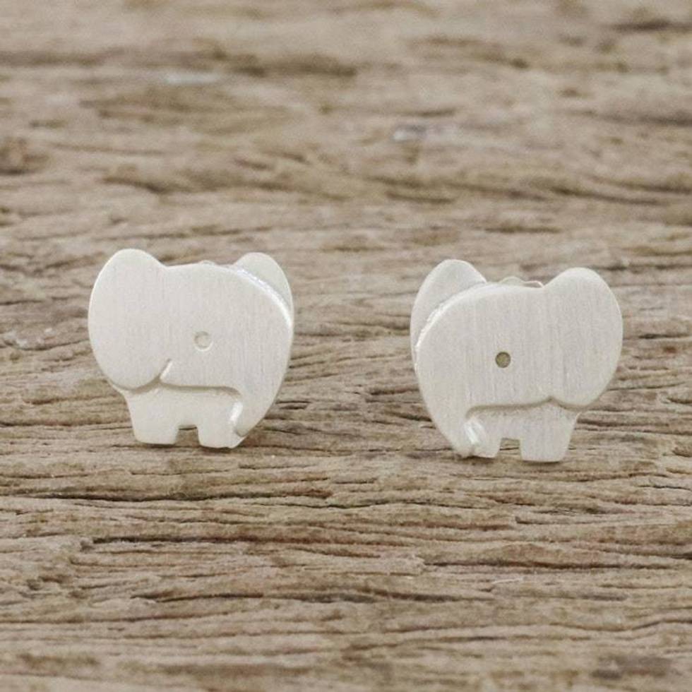 Brushed Sterling Silver Elephant Stud Earrings from Thailand 'Watchful Elephants' Item ID: 2676651833