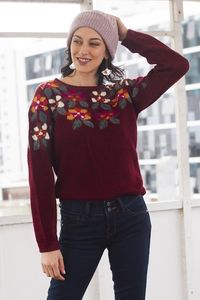 Burgundy Floral Intarsia Knit 100 Alpaca Sweater 'Burgundy Garden' Item ID: 2671667438