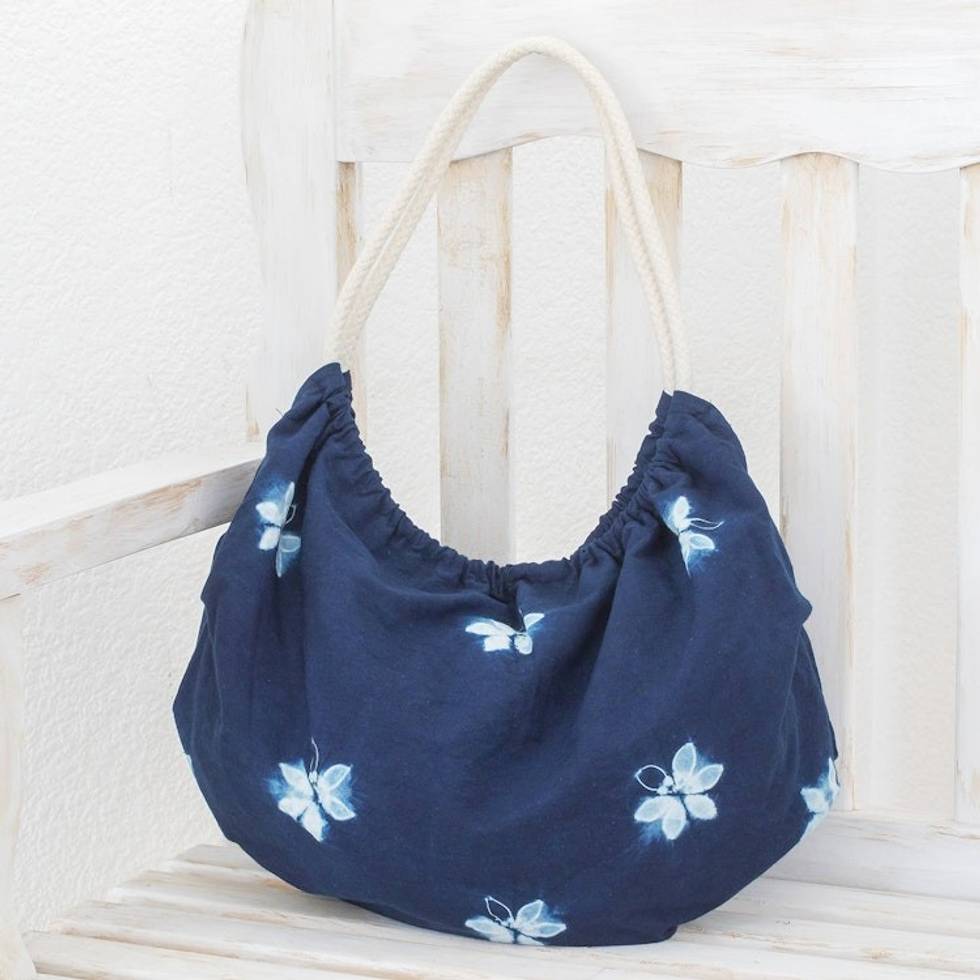 Butterfly-Themed Indigo Cotton Hobo Shoulder Bag 'Indigo Hope' Item ID: 2671770599