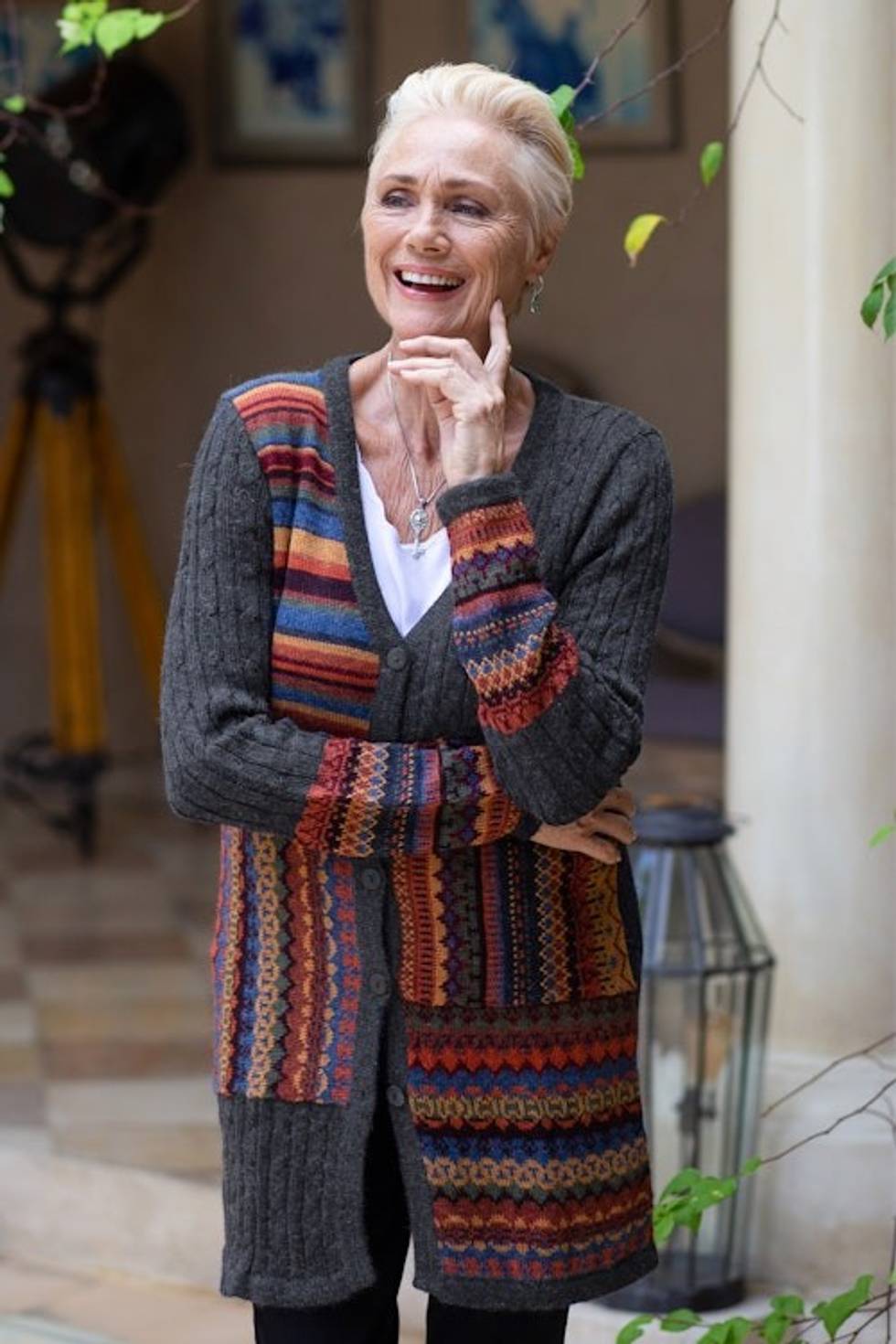 Beautiful color palette. Well made. I do wish the sweater was less tapered and more bulky