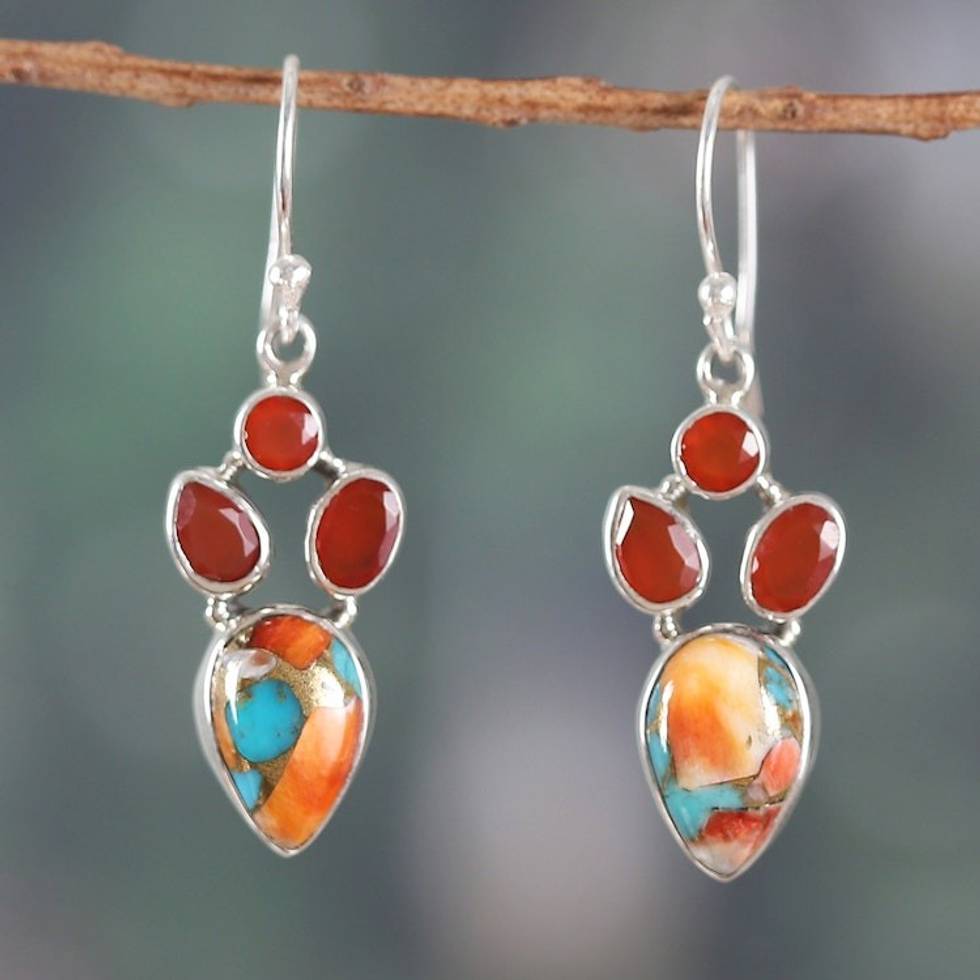 Carnelian and Composite Turquoise Dangle Earrings from India 'Song of Fire' Item ID: 2671783221