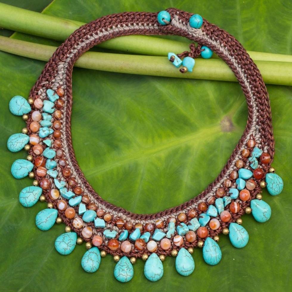 "With my background in arts, my designs have evolved since then, blending thread colors, laces, and colored stone. Some days I sit and enjoy late-night knitting sessions because I can't wait to see how the necklace looks when finished. I have improved my knitting and crochet skills so I include other local materials such as clothes from the different hill tribe's which are embroidered with beautiful patterns.