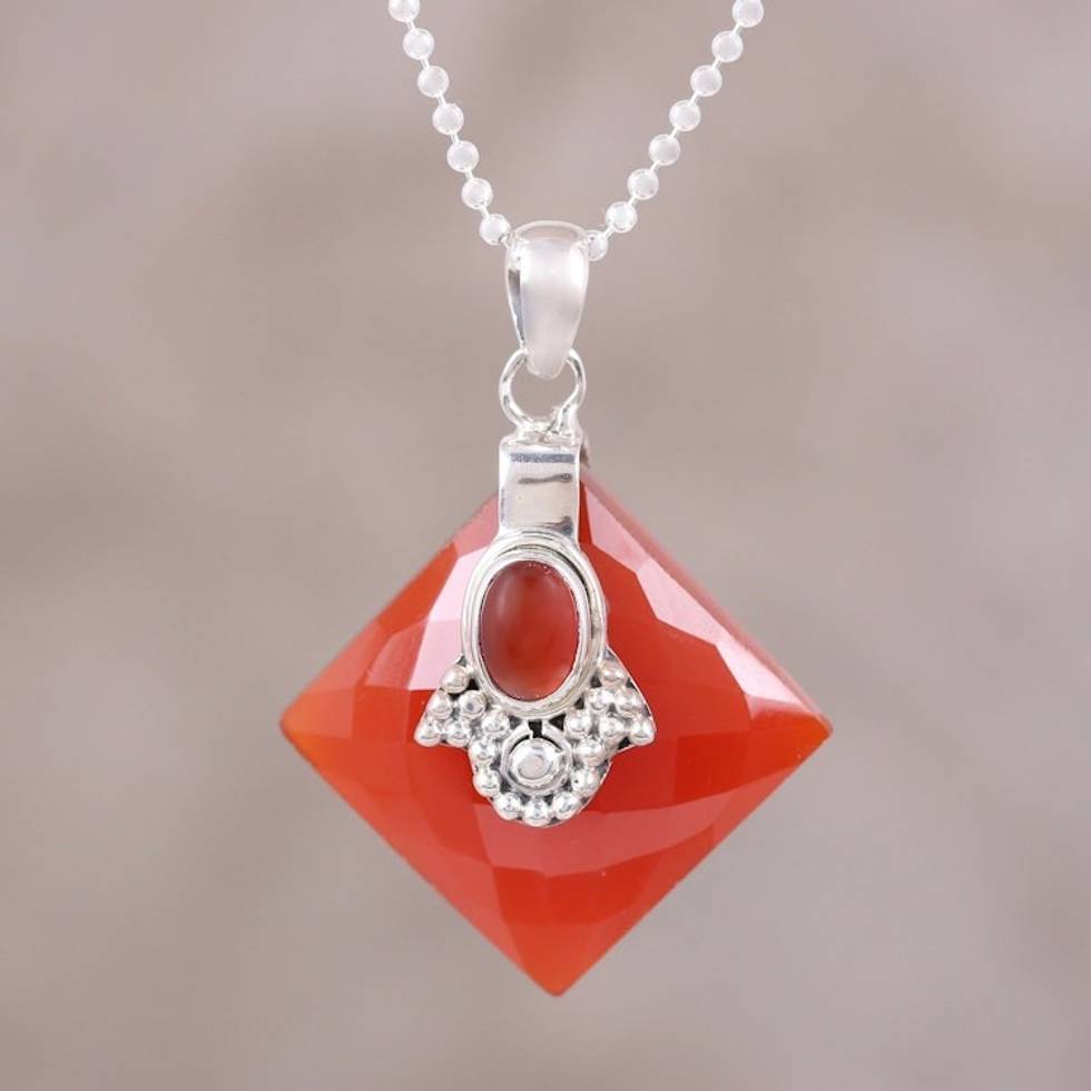 'Delhi Sunse't, pendant necklace has a carnelian stone that does not have a color that is the same as pictured. The color is subdued, red/amber shade. Darker that the earrings of the same design and name. However, the necklace and the earrings can be worn together and look attractive. The pendant necklace is medium size, eye catching, unique, youthful looking and pretty. Appropriate to wear with casual and dressy outfits.
