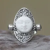 I had purchased a similar ring several years ago from a different source. I was very disappointed in it, and returned it. I have been looking for one ever since, and came upon this one from Buana. I have several of his other pieces, so I decided to take a chance. I am so glad I did!!! This piece is more lovely than the picture depicts. The silverwork is substantial and beautiful, but the face and carving are mesmerizing! When I opened it, I just wanted to sit and stare at it. The features are clean and sharp and the cow bone is so smooth and white. This is a BEAUTIFUL addition to my Buana collection!