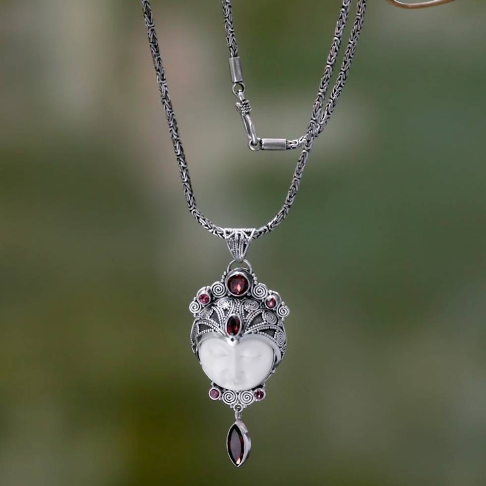 Carved Pendant Necklace with Garnet from Bali 'Layonsari' Item ID: 2669923236