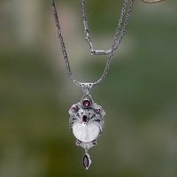 'Layonsari', carved pendant necklace with garnet is a pictured, with silver details and garnets of good color. Attractive chain, hangs pendant to good effect. Eye-catching. Well executed silver design setting for bone face carving. Happy with purchase.