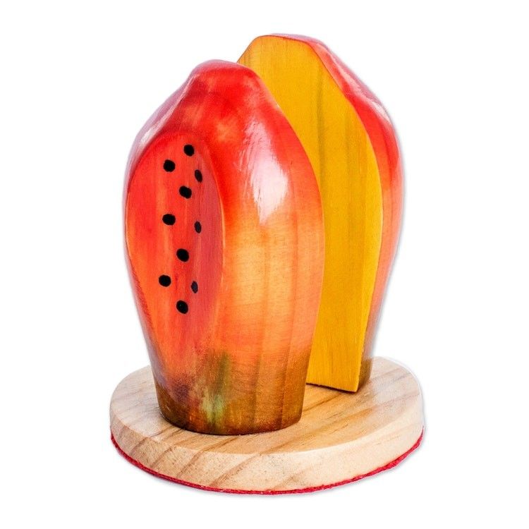 "Working with white pine wood, Julio Jimenez in Guatemala crafts this sweet napkin holder. Shaped and painted like a ripe papaya, the holder makes a fun addition to any kitchen."