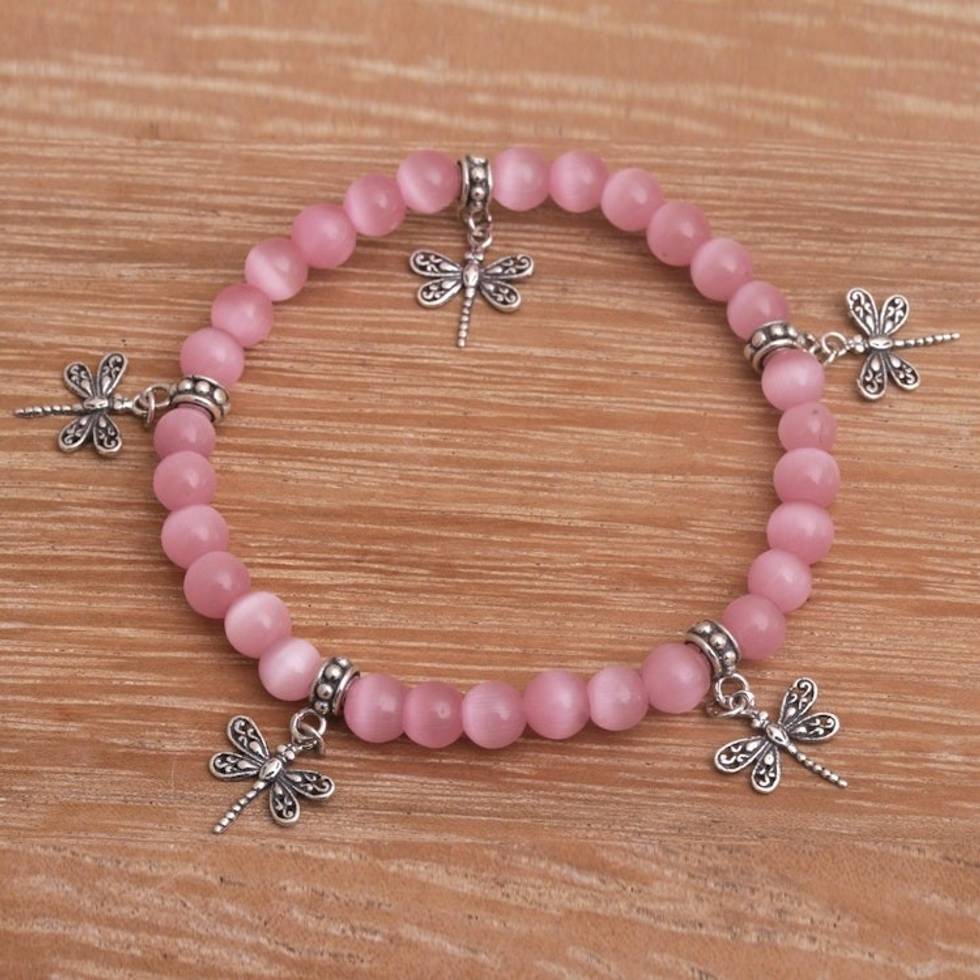 Cat's Eye Beaded Stretch Bracelet with Dragonfly Charms 'Dragonfly Blush' Item ID: 2671736645