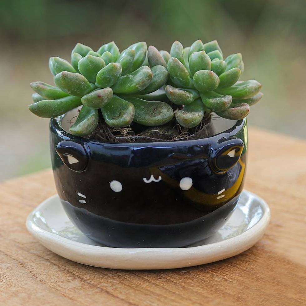 Cat-Themed Black Ceramic Mini Flower Pot with Ivory Saucer 'Kitty Splendor' Item ID: 2671798093