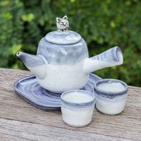 Cat-Themed Blue Ceramic Tea Set with Two Cups and a Tray 'Cozy Meows' Item ID: 2671797717