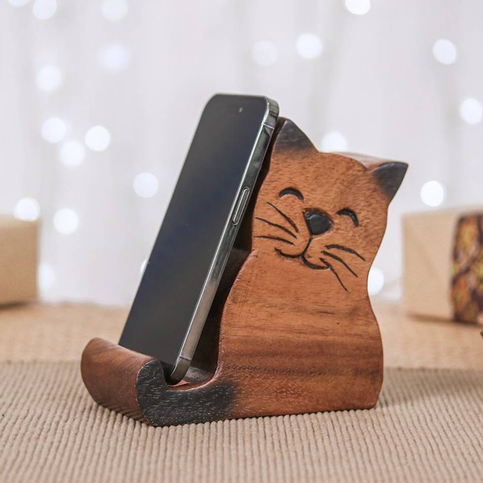 Cat-Themed Hand-Carved Raintree Wood Phone Holder 'Feline Support' Item ID: 2671640906