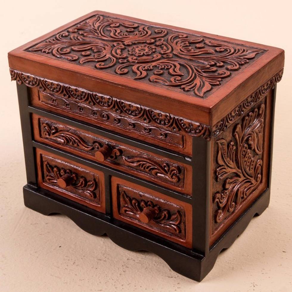 Cedar Wood and Leather Jewelry Box with Mirror from Peru 'Symbolic Leaves' Item ID: 2669904821
