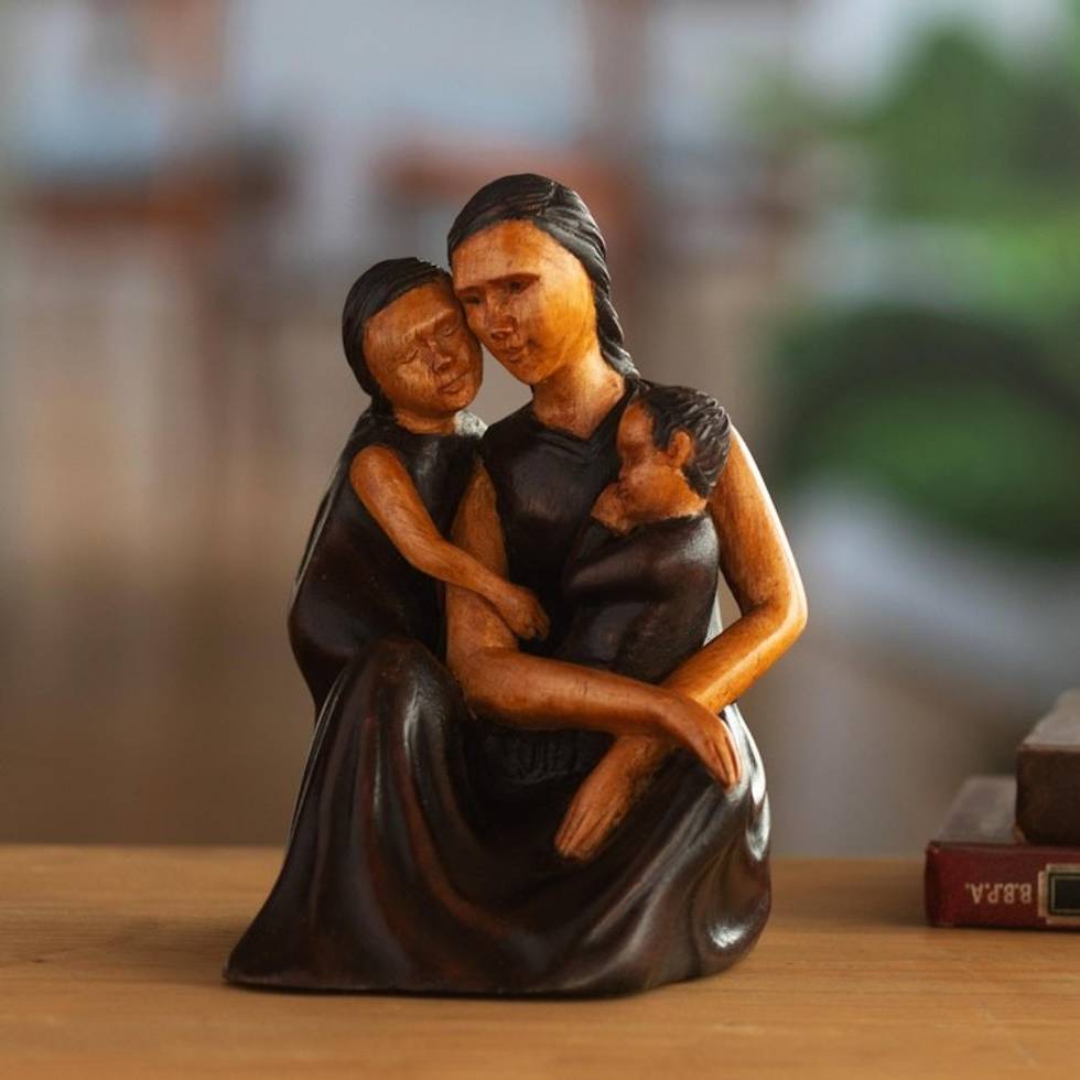 Cedar Wood Sculpture of a Woman with Her Two Children 'Protecting My Children' Item ID: 2669903873