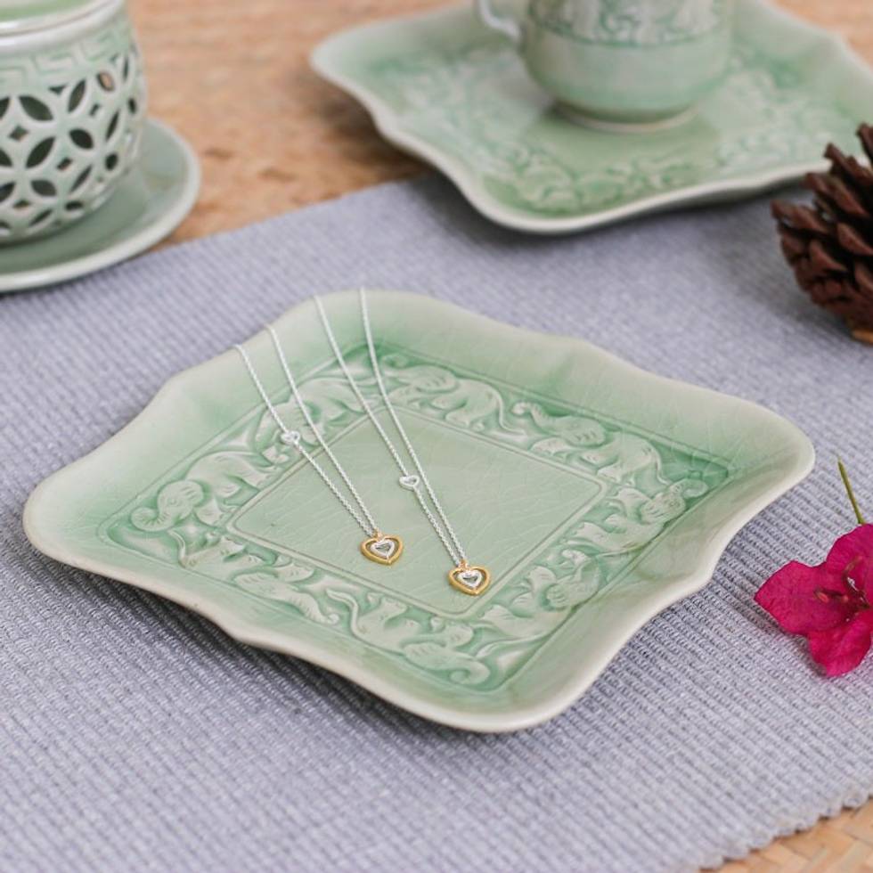 "One day, I met a celadon workshop owner who was going to close his business because he had no successor. When he learned that I wanted to do celadon, he gave me his entire mold. I persuaded a young sculptor, Mr. Prajuap, to build the kiln, and we began producing pieces together. We started with a lot of trial and error, and both felt discouraged. However, we both laughed through the trials and tried new production techniques to perfect the process for beautiful pieces. I then opened a small workshop where I invented ways to make the dishes look more interesting by carving patterns such as Thai flowers, elephants, and patterns from Thai literature. The patterns are delicate, beautiful, and drawn by local craftsmen.