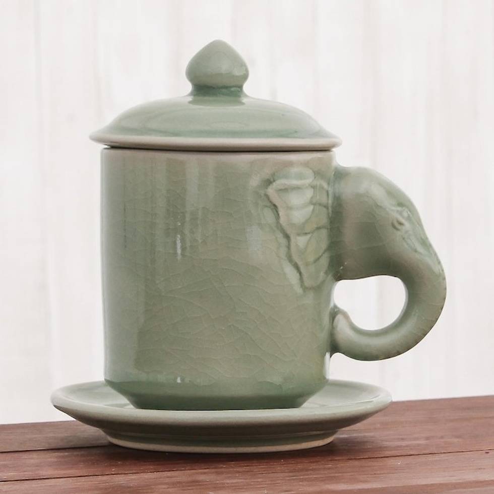 Celadon Ceramic Elephant Cup and Saucer from Thailand 'Chiang Mai Elephant' Item ID: 2671801034