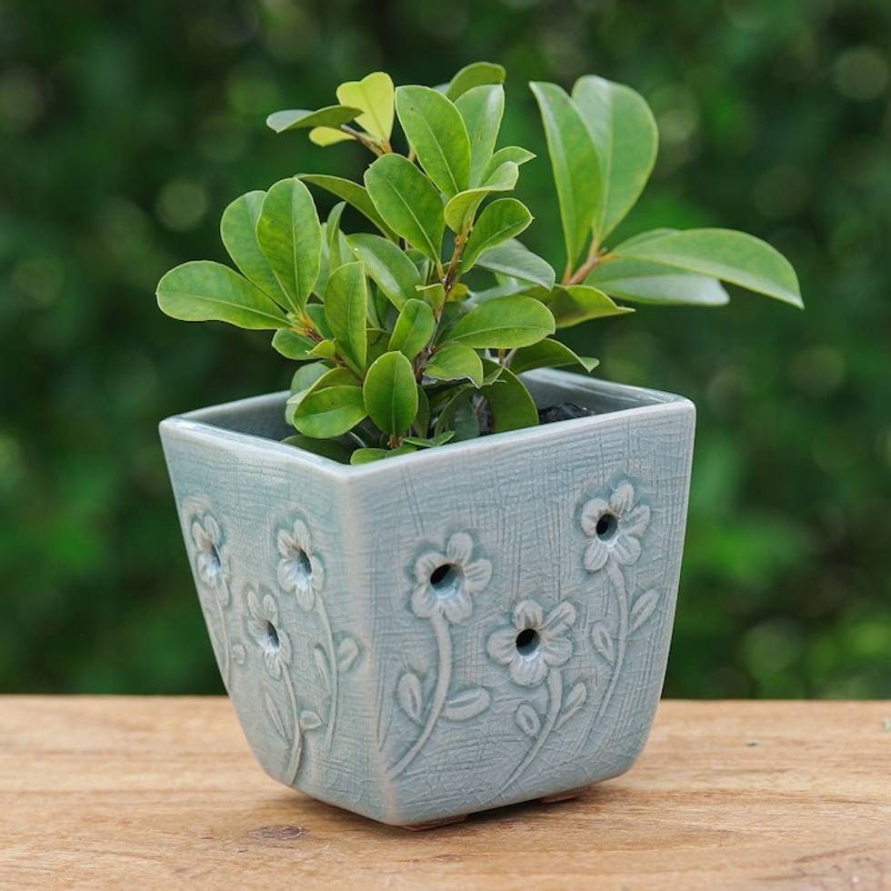 Celadon Ceramic Mini Planter with Floral Motif in Blue 'Blue Little Garden' Item ID: 2671815442