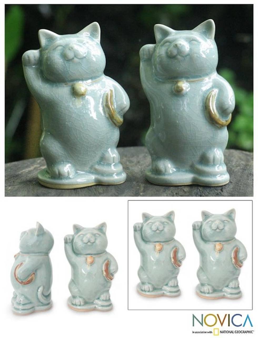Celadon Ceramic Sculptures Pair 'Charming Good Luck Cats' Item ID: 2671802647