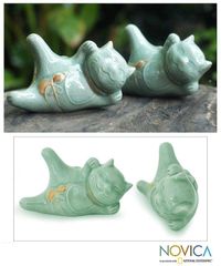 Celadon Ceramic Sculptures Pair 'Lucky Cats at Play' Item ID: 2671802570
