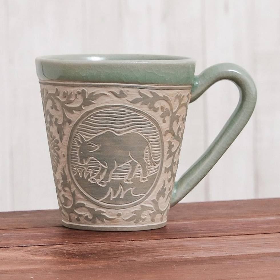 Celadon Glazed Ceramic Mug with Cow from Thailand 'Thai Zodiac Cow' Item ID: 2671801049