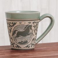 Celadon Glazed Ceramic Mug with Horse from Thailand 'Thai Zodiac Horse' Item ID: 2669892526