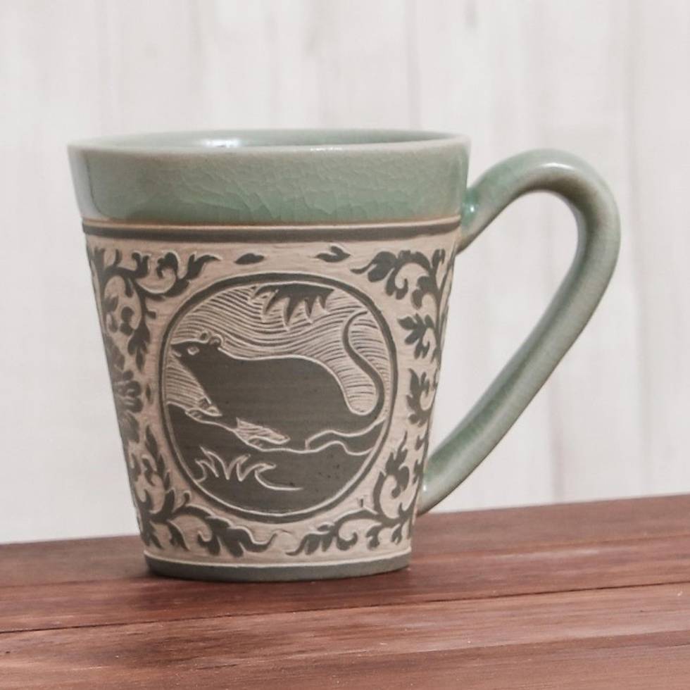 Celadon Glazed Ceramic Mug with Rat from Thailand 'Thai Zodiac Rat' Item ID: 2671801088