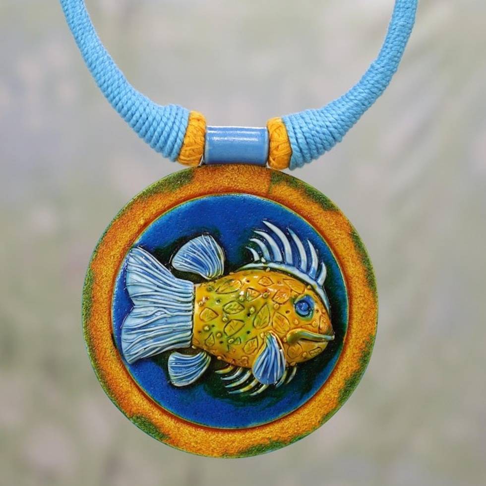 Ceramic and Cotton Fish Pendant Necklace in Blue from India 'Blue Angler' Item ID: 2671790166