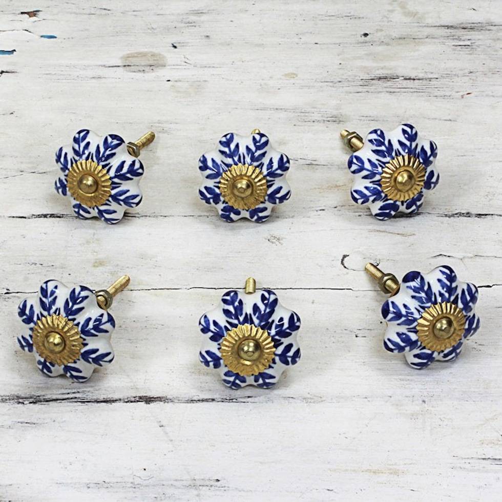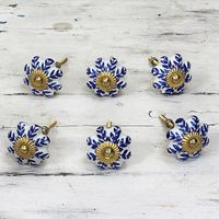 Ceramic Cabinet Knobs Floral White Blue Set of 6 India 'Blue Sunshine' Item ID: 2669943965