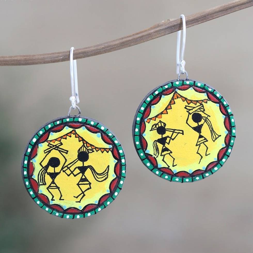 Ceramic Dangle Earrings with Dance Motif 'Warli Dancers' Item ID: 2671787743