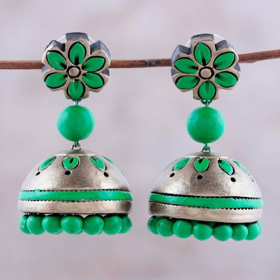 "Handcrafted of ceramic, these exciting dangle earrings by India's Deepti Lav evoke a lush garden. Deepti hand-paints each earring with green floral motifs over a gold-tone body, featuring creative baubles and domes that dangle."