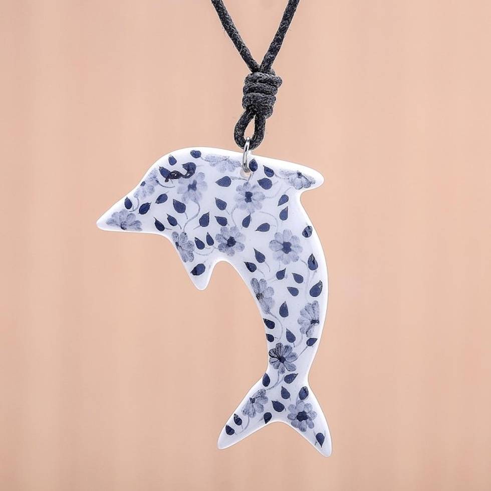 Ceramic Dolphin Necklace with Painted Blue Floral Motifs 'Blue Flower Dolphin' Item ID: 2671799177