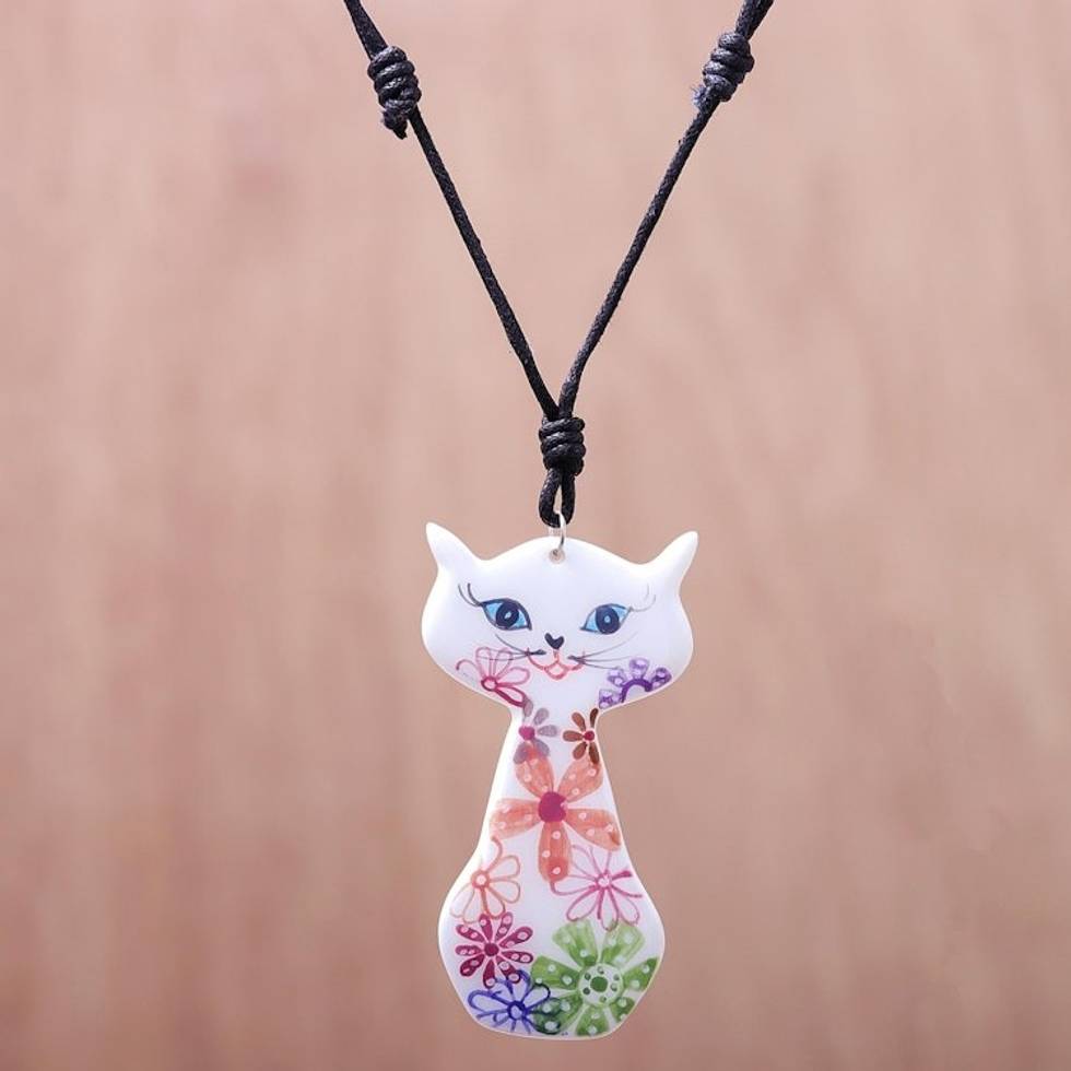 Ceramic Floral Cat Pendant Necklace from Thailand 'Daisy Cat' Item ID: 2671798384