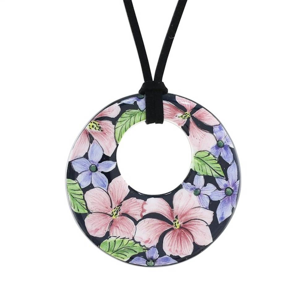 Ceramic Handmade Floral Painted Pendant Necklace 'Jepun Blooms' Item ID: 2671801219