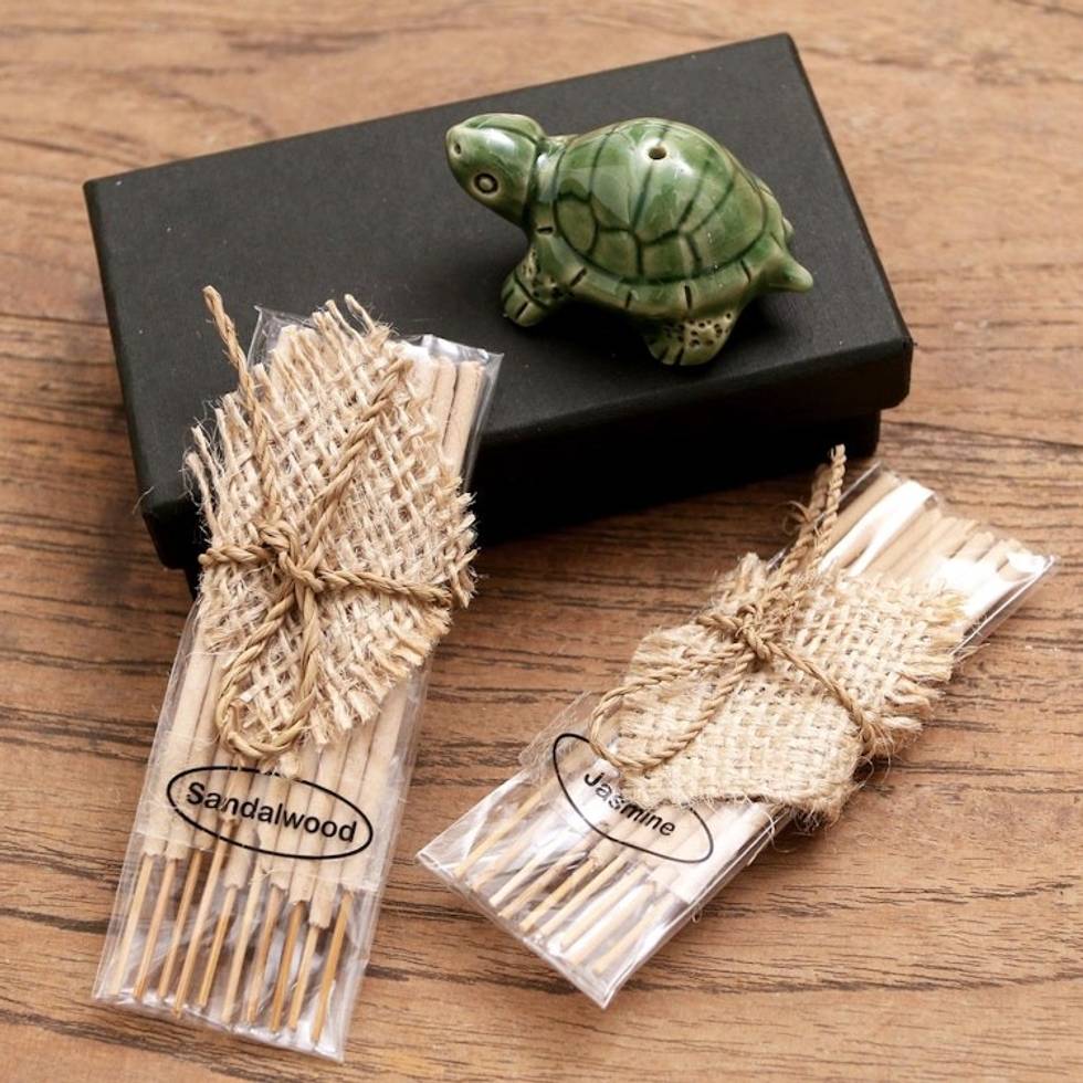 "Relax and breathe in the rejuvenating scents included with Balinese artisan Dewa Putra's incense set. The set is housed in a black cardboard box and includes one ceramic incense holder shaped like a turtle, 10 incense sticks in jasmine, and 10 in sandalwood."