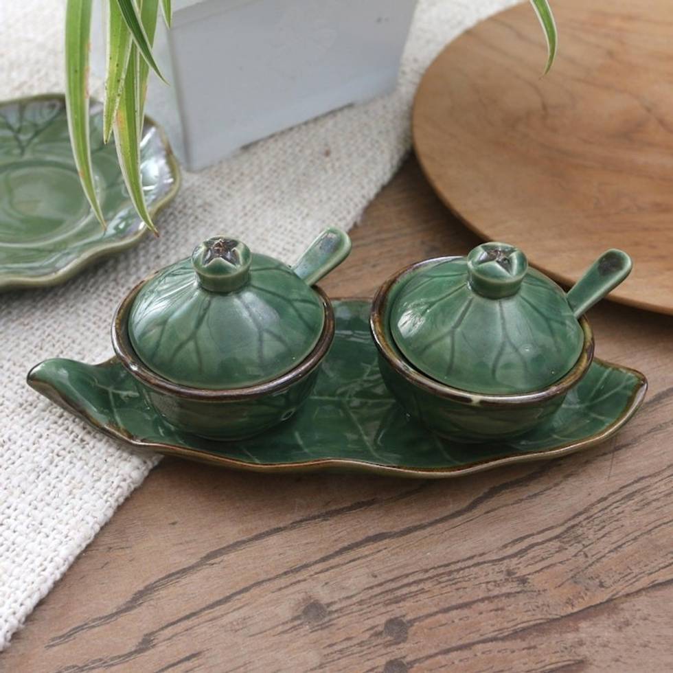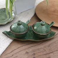 Ceramic Leaf-Motif Condiment Set from Bali 5 Pcs 'Leafy Surprise' Item ID: 2671747515