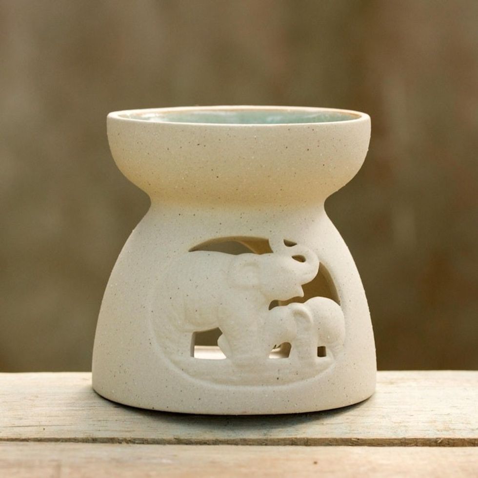 Ceramic Oil Warmer with Elephant Carving from Thailand 'Mother and Child Elephant' Item ID: 2671802236