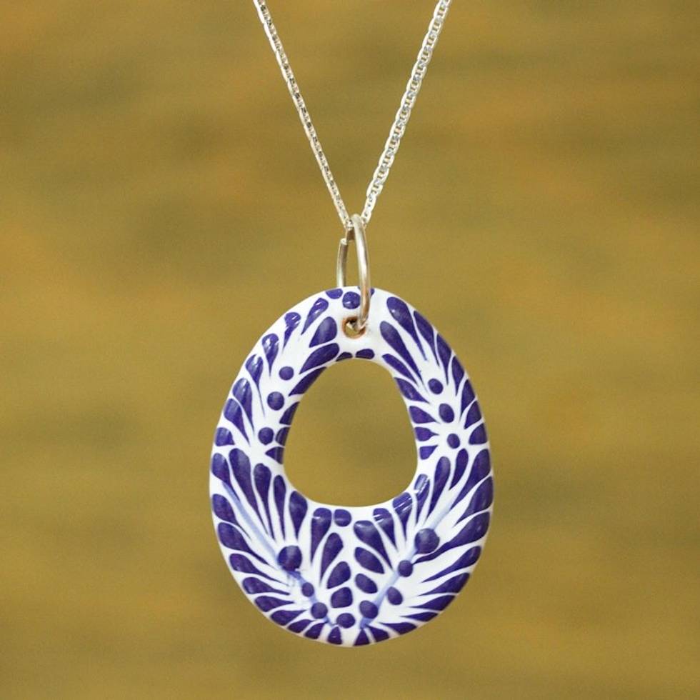 Ceramic Puebla-Style Blue Floral Egg-Shaped Pendant Necklace 'Indigo Morning' Item ID: 2669931149