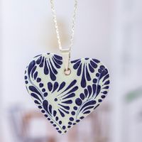 Ceramic Puebla-Style Blue Floral Heart Pendant Necklace 'True Blue' Item ID: 2671808744