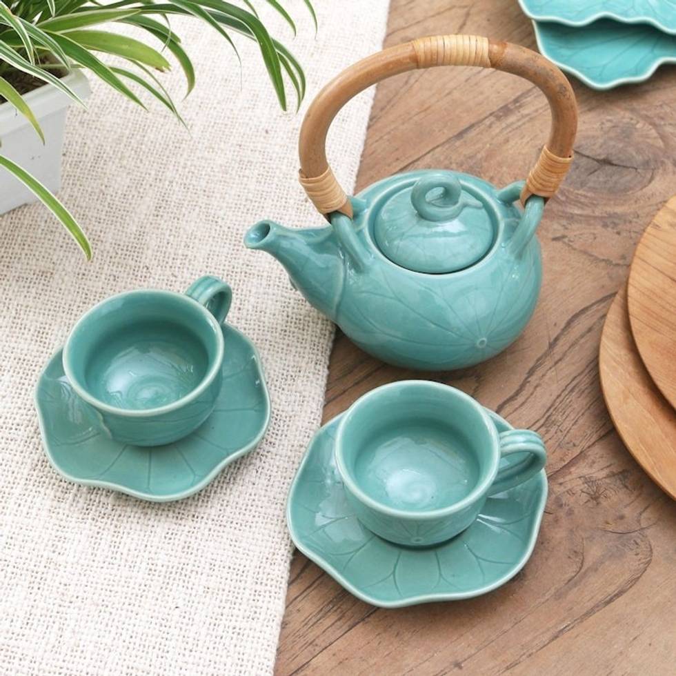 "With its beautiful teal color, Balinese artisan Nyoman Suarmini's charming tea set will put you at ease the next time you reach for a warm cup. Hand crafted from ceramic, the set includes one teapot with a bamboo handle, two cups, and two matching saucers with scalloped edges."