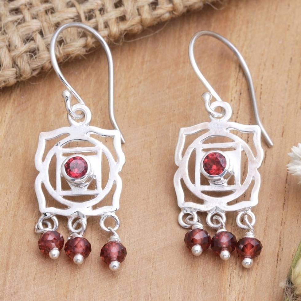 Chakra Themed Sterling Silver and Garnet Dangle Earrings 'Facing Chakra' Item ID: 2671748663